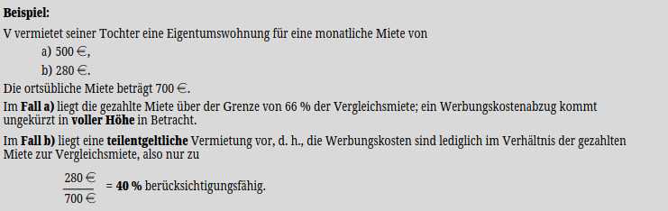 Bei einer verbilligten Vermietung ist zusätzlich zu beachten, dass eine sog. Entgeltlichkeitsgrenze eingehalten werden muss, wenn der Werbungskostenabzug in voller Höhe erhalten bleiben soll: Diese Grenze beträgt 66 % der ortsüblichen Miete (§ 21 Abs. 2 Satz 2 EStG).