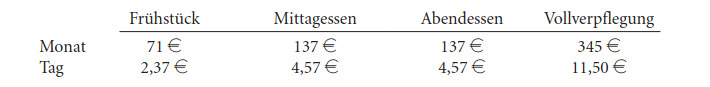 Der Wert für die freie Verpflegung setzt sich zusammen aus den Mahlzeiten Frühstück, Mittagessen und Abendessen. Die Monats- und Tagesbeträge für 2026 können der folgenden Tabelle entnommen werden: